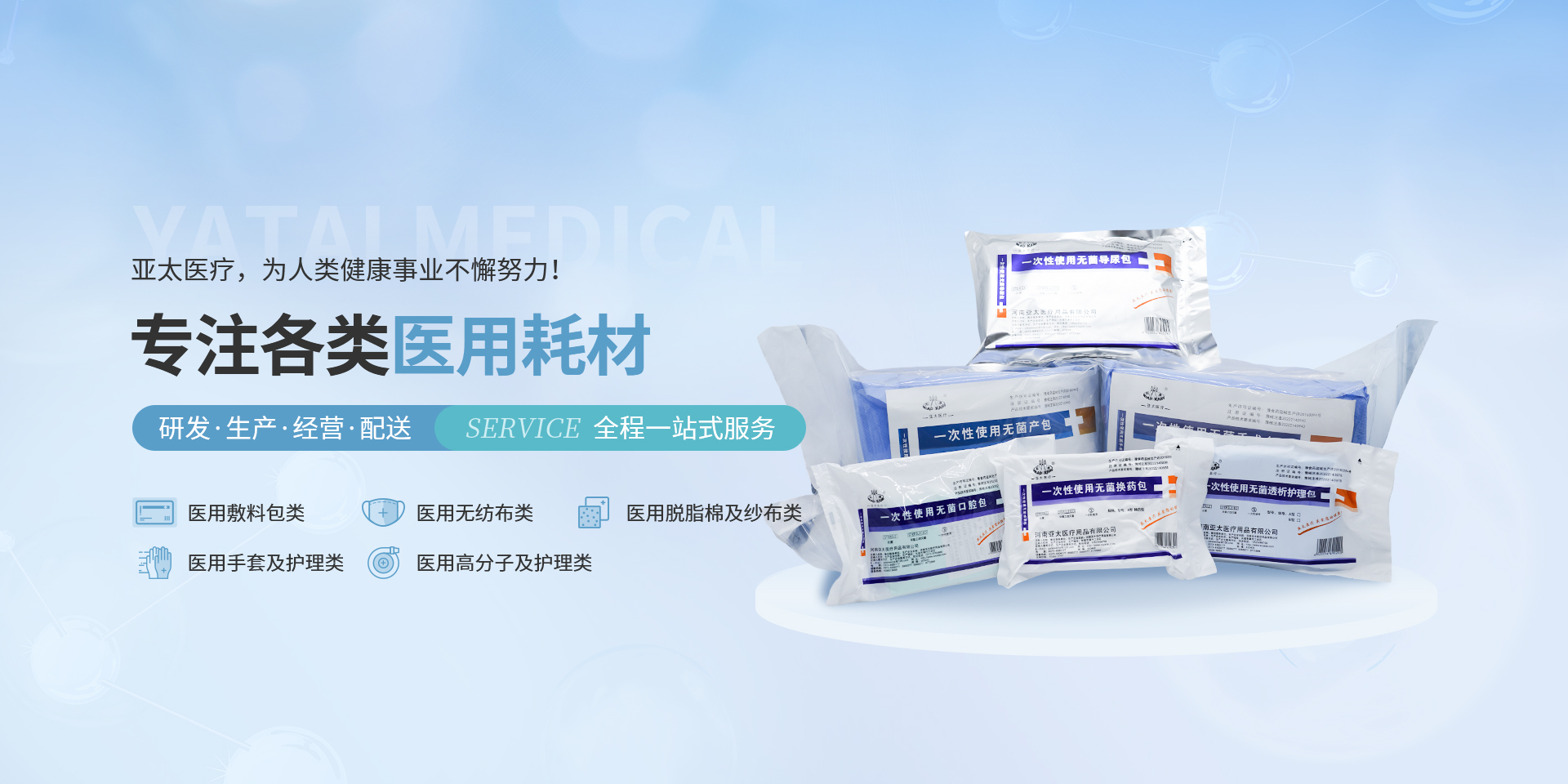 亞太始終專注于一次性醫(yī)療器械、衛(wèi)生材料、高分子及敷料產(chǎn)品的研發(fā)、生產(chǎn)和經(jīng)營(yíng),為人類健康事業(yè)的發(fā)展帶來(lái)深遠(yuǎn)的意義